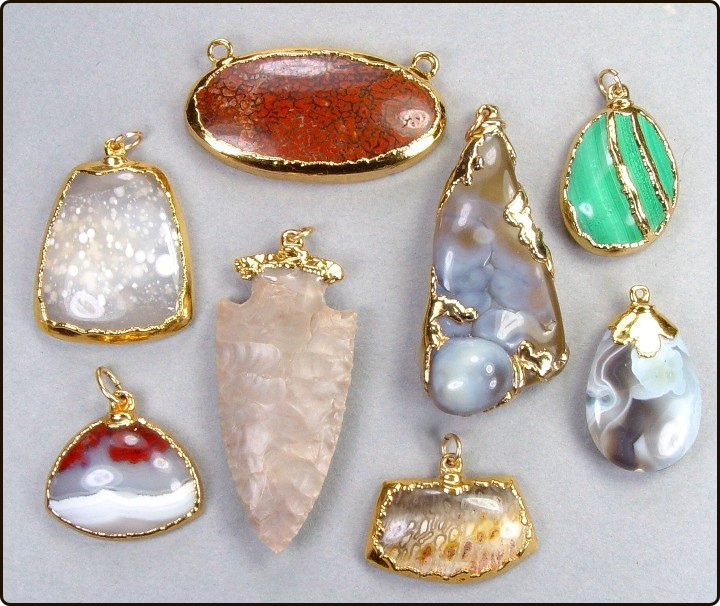 - Plating Style: How you would like each item plated. For example, a gold cap at the top of the item around the ring, a gold trim around the edge, a ring at each end, or on the corners of the pendant.