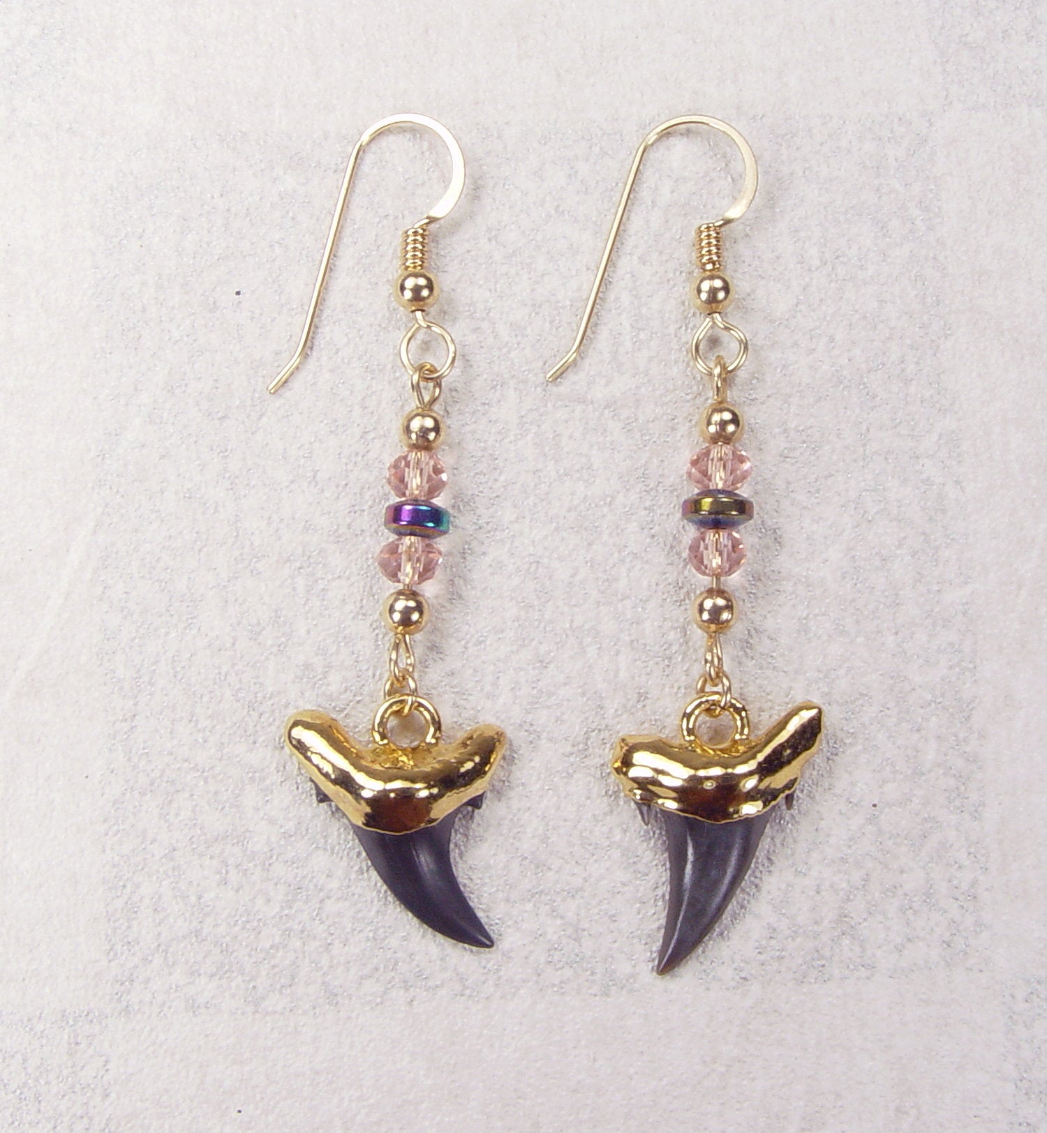 Fossil Shark Tooth Earrings with Beaded Connectors & Electroformed 18kt Gold